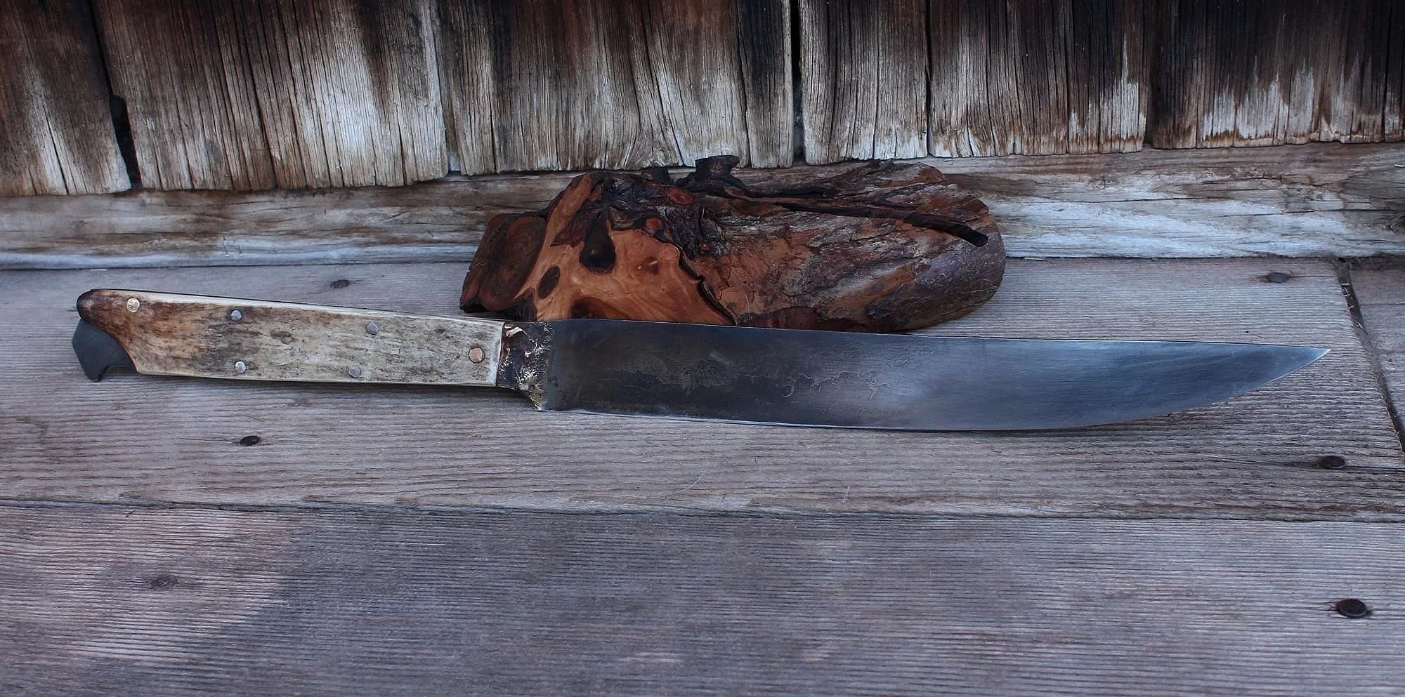 Upcycled spent saw blades. Big blades, some 6 feet in diameter. Lumber mill carbon steel from the Cariboo region of B.C. along with moose, deer and elk antler, fruitwood and B.C. native wood types.